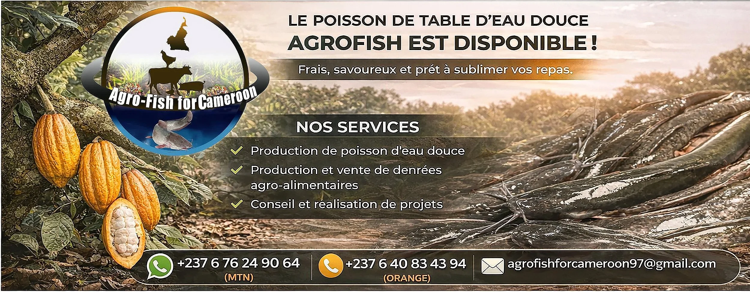 Agro-fish for Cameroon : au 237 Produire bio et consommer sain.Au cœur du Cameroun, entre les collines de Yaoundé II (Madagascar lieu dit pont Madagascar) et les terres fertiles d'Ekong et Nlong, une révolution verte et bleue est en marche. Agrofish for Cameroon n'est pas seulement une entreprise ; c’est le partenaire de votre indépendance alimentaire et le moteur de votre réussite entrepreneuriale.