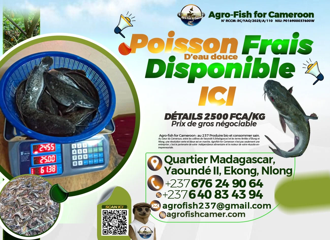 Agro-fish for Cameroon : au 237 Produire bio et consommer sain.Au cœur du Cameroun, entre les collines de Yaoundé II (Madagascar lieu dit pont Madagascar) et les terres fertiles d'Ekong et Nlong, une révolution verte et bleue est en marche. Agrofish for Cameroon n'est pas seulement une entreprise ; c’est le partenaire de votre indépendance alimentaire et le moteur de votre réussite entrepreneuriale.